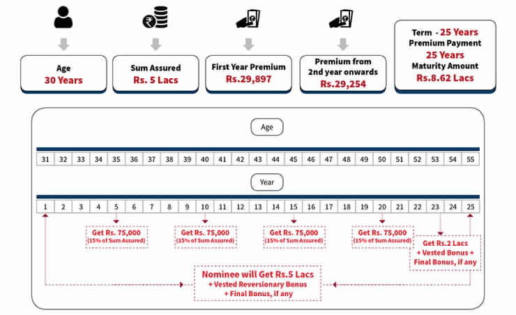 This plan also has the option of taking the Maturity proceeds in instalments as the policy-holder can choose the no of year as 5, 10 or 15.
